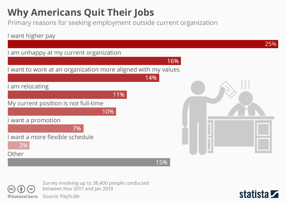 “Entitled ‘Why They Quit You’, PayScale found that 25 percent of workers seek employment outside their current organization because they want higher pay. While 16 percent of those polled say they search elsewhere because they are unhappy in their job. While 14 percent want to land a position in an organization more aligned with their values. Relocation is rarer, cited by 11 percent of those polled. And only 2 percent seek a new employer for greater flexibility.”