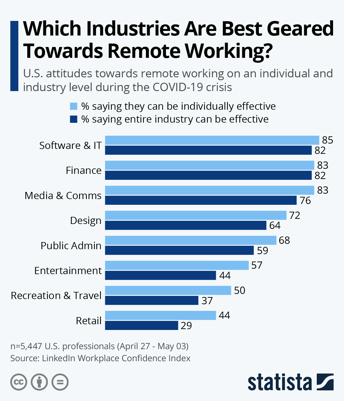 “The LinkedIn Workforce Confidence Index found higher levels of support for remote working in digital occupations requiring less physical contact. 85 percent of software and IT workers said they can be individually effective when working remotely. While 82 percent felt the entire industry could be effective. That confidence is underscored by Twitter’s announcement that it would allow all of its employees to work remotely on a permanent basis if they so desire, a move some observers called ‘era-defining’. The trend is also positive in finance where over 80 percent say they and the wider industry are effective while working remotely.”