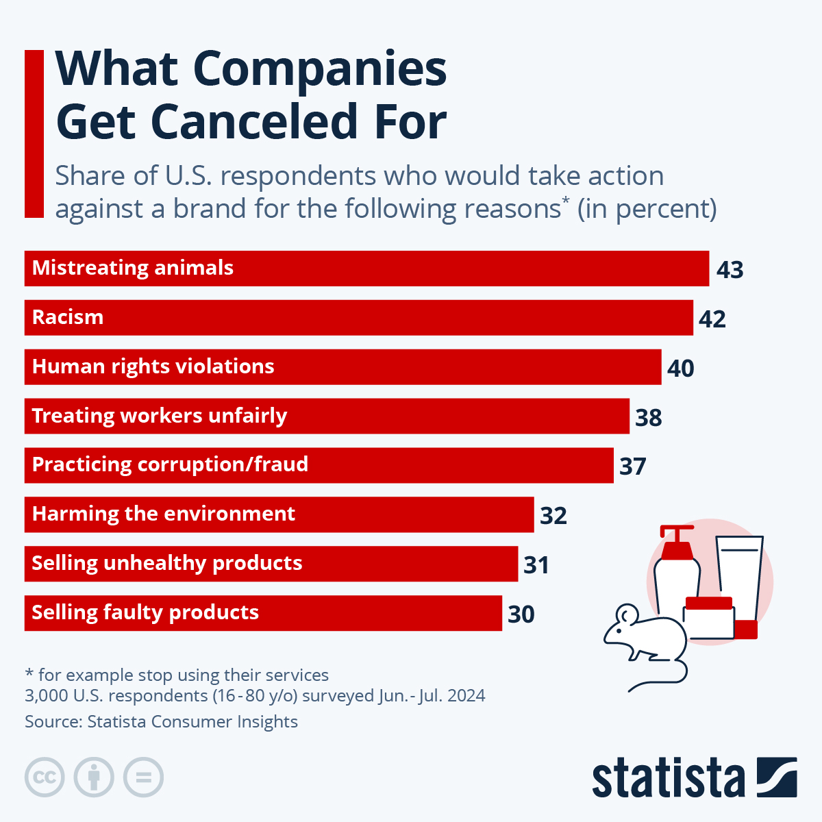 The number one reason to “cancel” a brand – or at least boycott or protest them – is the mistreatment of animals. Animal cruelty was named as the top reason why consumers would give up on a brand. In all three countries included in the Cancel Culture survey. Which is a content special of the Statista Global Consumer Survey. 44 percent of the more than 1,500 U.S. respondents said they would give companies mistreating animals the boot. That rated ahead of the mistreatment of workers at 41 percent. UK respondents saw things similarly. While in Germany, worker mistreatment only came in rank six after environmental harm, corruption, health concerns around products, and racism.